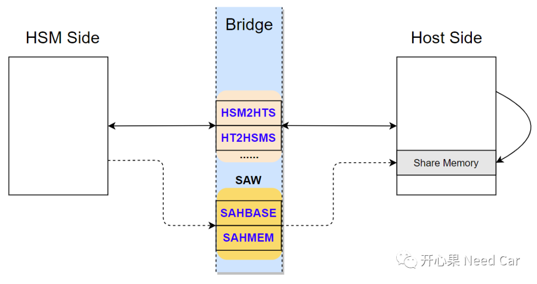 既然王母娘娘拆散牛郎(Host)和织女(HSM),就没打算让他们轻易见面。怎么办呢?喜鹊是看不惯王母娘娘做派的,喜鹊不仅铺好鹊桥(Bridge),还在桥让搭建了一个会和点(SAW,Signal Access Window)。通过这个内存访问窗口,织女(HSM)就可以把想想说的话(Message)传递给牛郎(Host),反之,亦然。考虑到牛郎和织女每年只能见一次,喜鹊是很给力的,它们搭建的汇合区(ASW)很大,有多大呢?窗口 最大可以达到64KByte,也就是说,HSM一次可以访问64KByte的Host地址空间,通过修改访问窗口地址和长度,最终可以访问Host端的0x00000000 - 0xDFFFFFFF地址空间。 牛郎(Host)和织女(HSM)为了及时的告知彼此近况,通过HT2HSMS(Host to HSM Status)、HSM2HTS(HSM to Host Status)寄存器告知彼此状态。 HT2HSMS、HSM2HTS双方均可互相访问 ,以便于及时获悉彼此状态。除了这两个寄存器 ,还有HT2HSMF(Host to HSM Flag Register)等寄存器,牛郎和织女可以共同访问,以便于说更多的悄悄话。 女人,总是爱管事的,织女(HSM)除了想知道牛郎(Host)的近况,还想知道牛郎平时都在干啥,所以,织女(HSM)就通过SAHBASE(Single Access to Host Base Address Register)、SAHMEM(Single Access to Host Memory Window)寄存器去牛郎田里 (Shared Memory)瞅瞅(Access),种的什么庄稼,土豆、胡萝卜还是南瓜呢?当然,牛郎(Host)对织女(HSM)的思念也可以通过SAHBASE、SAHMEM寄存器 直接写到田梗上(共享区),之后织女(HSM)去田梗查岗的时候(读取数据),即可知道牛郎(Host)想说啥。织女(HSM)也可以把想传递的信息通过SAHBASE、SAHMEM寄存器写入到田梗上(共享区,Share Memory ),以此提醒(通知)牛郎(Host),要给庄稼浇水或者施肥了。 HSM和Host的通信示意如下所示: