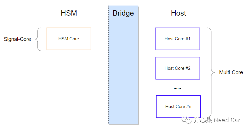 由于HSM主要任务是处理信息安全相关的操作,它所干的活需要与主芯片端隔离,不能让Host端知道HSM是如何干的,否则,就谈不上信息安全。因此,就出现了HSM端(HSM Side)和Host端(Host Side),两者中间,有一座"鹊桥"(Bridge)。通过喜鹊搭建的Bridge,牛郎(Host)就 可以与织女(HSM) "互诉衷肠"了。 在MCU中,除了HSM的其他处理器均称为Host ,eg:TC3xx中,HSM Core是一个ARM Cortex M3内核,而Host Core则是多个Tricore内核。所以,所有的Host Core均可称为Host,每个Host Core均可以调用HSM功能,示意如下: