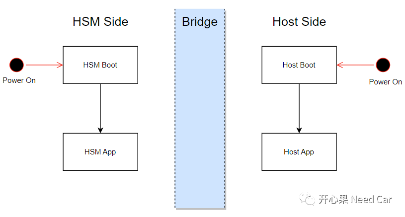 HSM除了芯片的硬件模块,还有对应的软件部分,当软件中包含HSM时,整个软件程序将至少包含4个进程:HSM Boot、HSM App、Host Boot以及Host App。ECU加电,HSM端,程序运行顺序:HSM Boot->HSM App;Host端,程序运行顺序:Host Boot->Host App,如下所示: