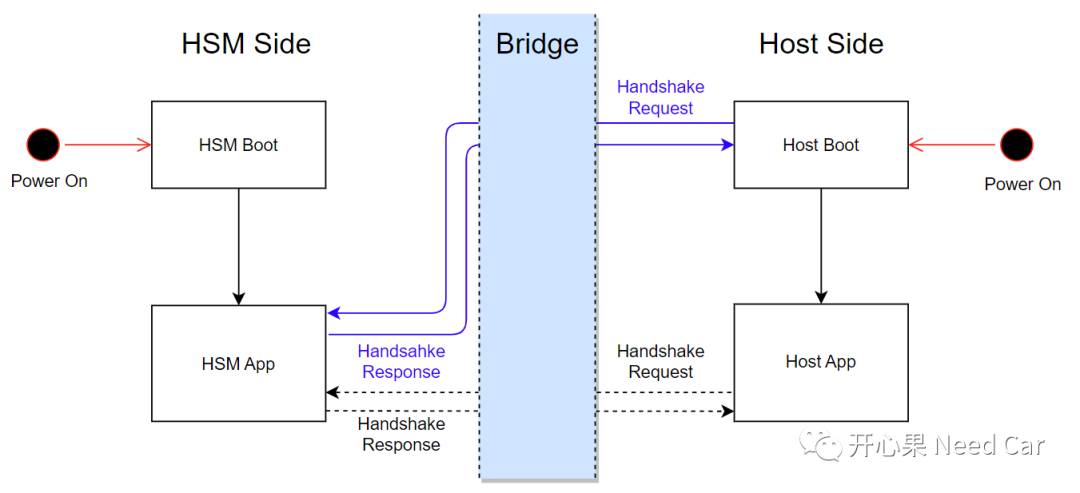 如上,只是知道了HSM与HOST如何通信,但是,在两者能有效通信之前,需要提前对好"暗号",也就是俗说的"握手"(Handshake)。为什么需要握手呢?如上信息可以看出,HSM和HOST对应不同的Core,在一些芯片中,HSM和HOST的CPU架构也可能不同。既然是不同的Core,意味着:芯片加电以后,两者启动的先后顺序存在不确定性。如果HOST端要使用HSM提供的功能,就必须等到HSM完成初始化动作 ,确保HSM进入了程序稳定阶段,否则,HSM无法执行Host的请求。