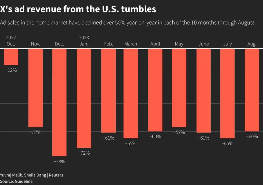 对于马斯克来说,裁员和改代码只是手段,把 X 打造成「数字城市广场」才是目的,他希望开源算法,驱逐机器人水军,允许人们「在法律范围内」随心所欲地发布内容。于是,他火速开除了信任和安全团队的大部分员工,邀请特朗普重返 X,还彻底改变了验证机制,将公众人物才有的「蓝 V」,改为面向全体用户的付费订阅,只要满足状态足够活跃、提供电话号码等条件,就能享受尊贵标识和更多功能。张信哲唱过「怎么忍心怪你犯了错,是我给你自由过了火」,固然付费认证可以区分僵尸账号,但大量冒充品牌、名人和政客的假账号也随之涌现,X 在去年 11 月叫停了「蓝 V」订阅,又在 4 月重新推出。X 目前的付费订阅方案分为三种:每月 3 美元的 Basic、每月 8 美元的 Premium、每月 16 美元的 Premium+。Premium 及以上的用户即有资格申请「蓝 V」,为了避免假账号再扎堆,X 还为企业、组织等推出了「金 V」或「灰 V」,与 QQ 会员的黄蓝红钻有异曲同工之妙。广告业务是 X 最主要的衣食父母,但因为假冒账户、不良内容可能带来的品牌安全风险,不少广告商落荒而逃。5 月,琳达·亚卡里诺代替马斯克担任 X 的 CEO,她曾在 NBCUniversal 领导全球广告业务,所以她的上任被外界解读为重建 X 和广告商的关系,同时马斯克也能腾出手来专注于产品和工程。10 月 26 日,琳达在官方博客写道,去年排名前 100 的广告商中有 90% 回归了 X。然而今时不同往日,广告商就算回来了,预算也不复从前。Guideline 的数据显示,自收购以来,X 的美国市场广告收入不断下降,每月同比下降至少 55%。唱衰的声音再多,马斯克「虽千万人吾往矣」,他在 7 月大刀阔斧地把 Twitter 改名为 X,新 logo 被批评是「审美大降级」。#GoodbyeTwitter 的话题、层出不穷的梗图、骤降的下载量和激增的负面评论,成了「小蓝鸟」最后的波纹。出走半生,归来仍是少年,种种折腾下来,X依然是流量最大的社交网络之一。或许最让马斯克高兴的是,Meta 在 7 月推出的 Threads 用户数量仍然远少于 X,远远不足为虑。几天前扎克伯格还因为训练伤了膝盖,两人相约的笼斗更加遥遥无期。人无法两次踏进同一条河流,我们也不能以过去的眼光看待马斯克的 X。为了衡量一个社交平台是否成功,原来的 Twitter 首创了 mDAU(可变现的每日活跃用户)的指标。但马斯克觉得不够,提出了一个新概念:不后悔的用户分钟数。去年 12 月,他曾公开表示,听很多人说后悔在 TikTok 上花了两个小时,不想 X 也是这样。李佳琦的「全网最低价」是不许别人卖得更便宜,马斯克的「无悔分钟数」是尽量减少花花世界的吸引力,原地解决人们线上生活的一切。从 8 月开始,把外部网站的新闻链接分享到 X 时,标题不再出现,有些用户可能以为刷到的只是图片。这直接影响了跳转链接的概率和新闻网站的流量,但马斯克表示是「为了美观」。并且更欢迎创作者在 X 直接发布长篇内容。毕竟,在 X 发布多于 280 个字,就得订阅 Premium,马斯克多赚了一分钱,同时X还在开发自己的富文本编辑器,按马斯克的话说,将支持发布「带视频的插图小说」。为了留住用户,马斯克还押注了视频,认为「视频是消费信息的最佳方式」,他曾考虑带回 2016 年被 X 关闭的短视频应用 Vine,最近又对标了 YouTube,希望将 X 内置在电视中。相对应地,X 改善了直播、长视频等功能,欢迎用户上传整部电影,马斯克偶尔也会用直播视频游戏的方式亲自测试。未来,X 有望提供体育比赛和火箭发射的 4K 直播,也在YouTube、TikTok 主导的视频广告市场分一杯羹。有了更丰富的文本和视频内容之后,X 还将大幅改进语义搜索,当用户输入搜索词,可以看到意思相符的文本、图片和视频,而不仅仅是完全的文本对应。内容是 X 的本职,马斯克不满足于锦上添花,他要疯狂跨界,他要无限可能,他要靠一个平台就吹出人类的未来。7 月曝光截图的音视频通话,X最近在 iOS 推出了初期版本,很快也会发布到 Android,所有账号都可以接听电话,包括关注人或通讯录的电话,但只有 Premium 用户可以发起通话。如果呼叫他人,那么对方必须至少发来过一次私信。音视频通话将适用于 iOS、Android、Mac 和 PC,并且类似 FaceTime,拨打可以无需知道电话号码。马斯克所希望的是,X 最终成为「全球的通讯录」。未来的 X 全体员工会议,将每季度举行一次,下一次会议就将使用 X 的视频通话功能,甚至进行直播,让公众也可以观看。以 PayPal 打响名声的马斯克,更是从未放弃对金融和支付业务的野心。X 最近在新西兰和菲律宾试点,让当地用户每年支付 1 美元的服务费,简单粗暴地打击机器人,如果试点成功,以后可能会推行到更多地方。马斯克觉得,直接让用户付费,比让你找哪张图片有红绿灯的测试题更加高明。每年 1 美元对任何人来说都微不足道,但如果想做 10 万个机器人,仍然是昂贵的,必须有 10 万美元才能获得 10 万个机器人,并且需要 10 万种付款方式。