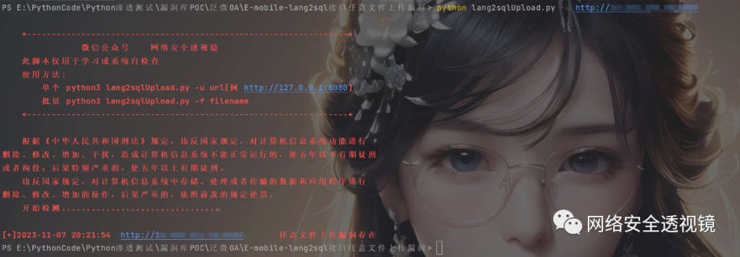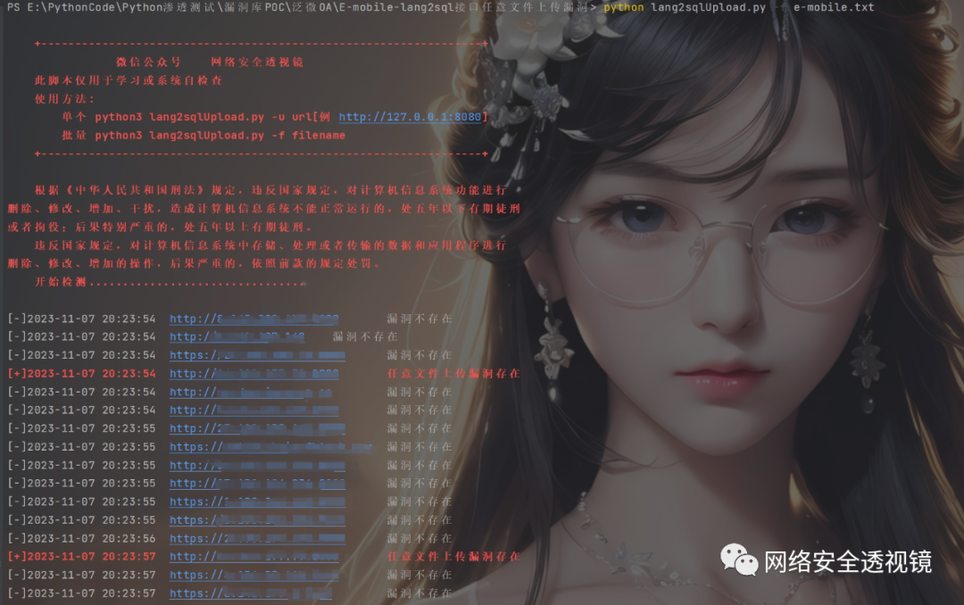 python lang2sqlUpload.py -f filename关注微信公众号 网络安全透视镜 回复 20231107 获取批量检测脚本