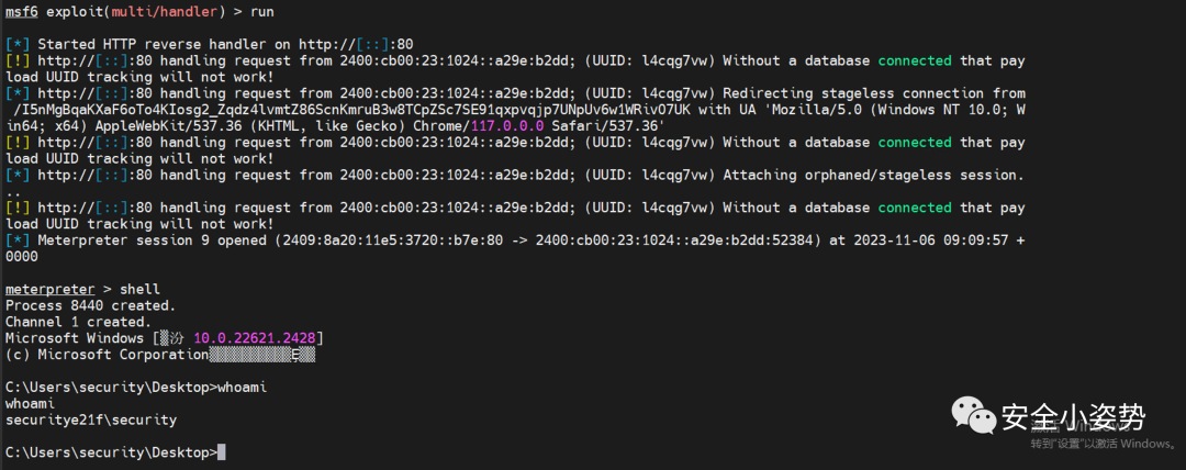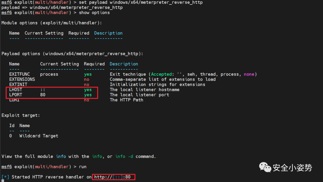 这里监听的细节是 set LHOST :: 表示监听本地的 IPv6 地址: