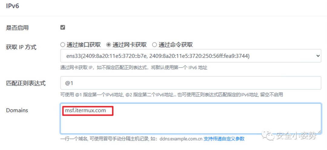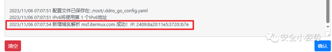 通过 DDNS-GO 的日志可以看到 msf.itermux.com 域名成功解析到了我们的公网 IPv6 地址: