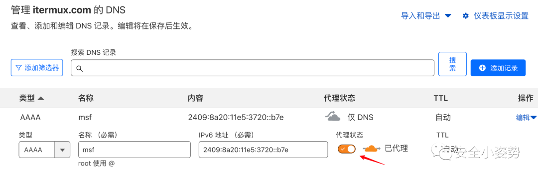 因为当前默认域名解析的是 IPv6 地址,IPv4 设备是无法访问到我们的域名的,为此我们需要手动开启 CF 的代理,借助 CF 将域名转换成 IPv4 也可以访问的 IP 地址: