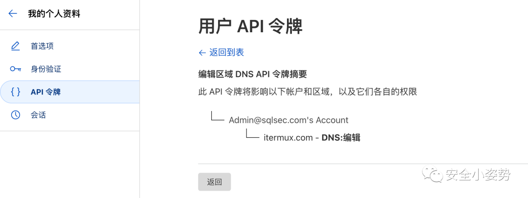 为了保持权限最小化原则,我们这里只创建一个修改 itermux 域名的 DNS 权限 API 令牌: