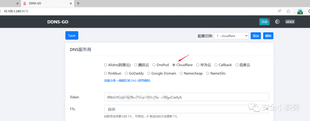接着访问服务器的 9876 端口即可打开 DDNS-GO 的配置页面,首先填写我们的 CF 的 API Token: