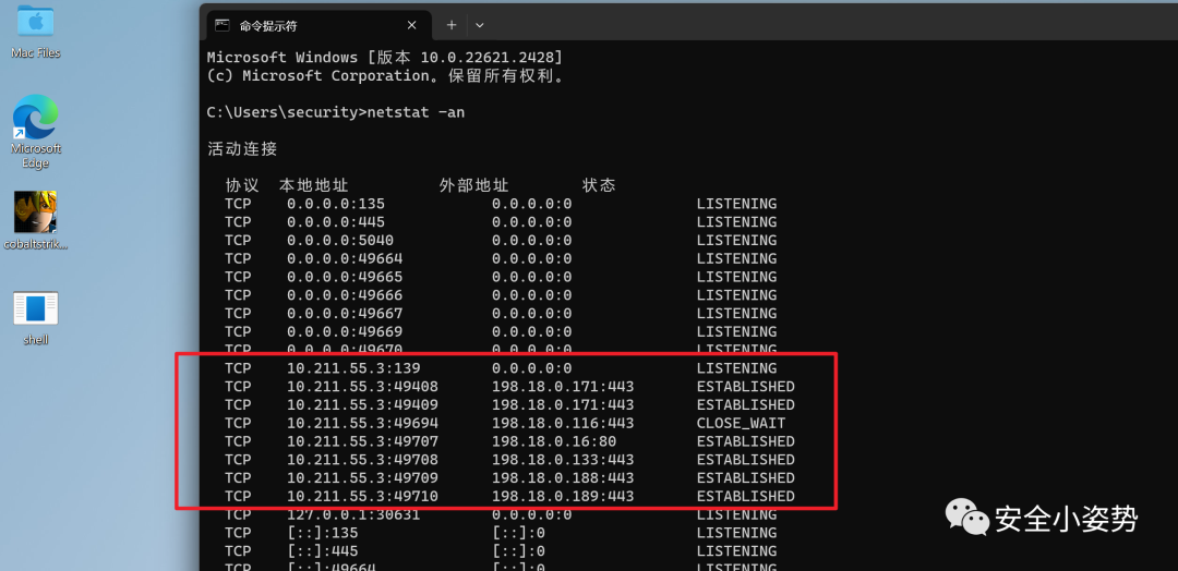 运行 shell.exe 后既上线成功,通过 netstat 命令查看,可以看到多个上线的会话连接,这些外连 IP 均为 Cloudflare 的 CDN IP,蓝方防守的话封是封不完,而且不敢封的,因为国内很多大型网站可能也用的是 Cloudflare。