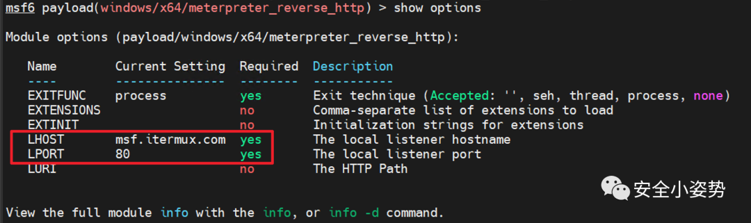 我们使用 meterpreter_reverse_http的 Payload,HOST 填写我们的 IPv6 地址 DDNS 的域名 msf.itermux.com,端口就填写 80 端口: