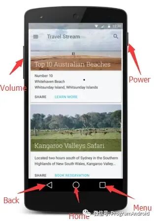 Back、Home、Menu、Power、Volume 按键图