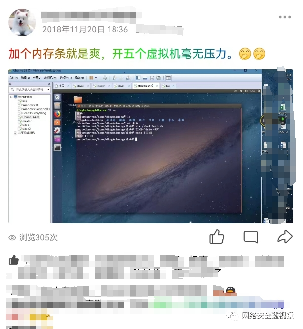 再后来学安全时候,有时候需要多开虚拟机,还有很多软件要同时打开,内存多少有点不足,又用奖学金,在双十一时候花了几百大洋买了个8G内存条,16G的内存多开虚拟机完全够用。学大数据时候搞了个什么分布式(现在已经不记得了)计算环境,开了5个虚拟机,其实我自己也震惊了,给大家看看我当时发的朋友圈。