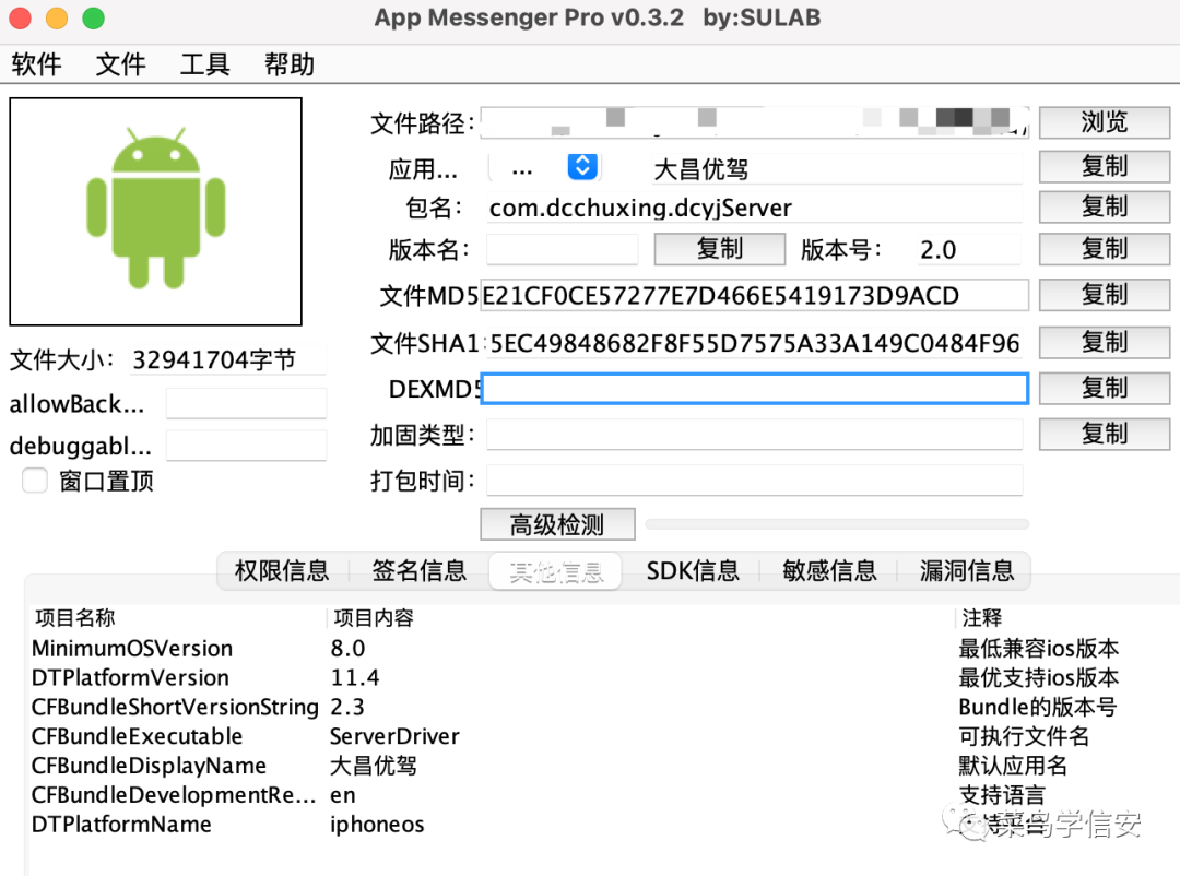 一款适用于以APP病毒分析、APP漏洞挖掘、APP开发、HW行动/红队/渗透测试团队为场景的移动端(Android、iOS)辅助分析工具,可以帮助APP开发工程师、病毒分析师、漏洞/安全研究员提高工作效率,帮助渗透测试工程师、攻击队成员/红队成员快速收集到移动端中关键的资产信息并提供基本的信息输出,如:包名(packageName)、版本(versionName\versionCode)、应用签名(Signature)、文件MD5、SDK、URL、APP漏洞等信息。- 日常渗透测试/攻防演练中对APP中涉及的关键资产信息收集,比如URL地址、IP地址、关键字等信息的采集等。