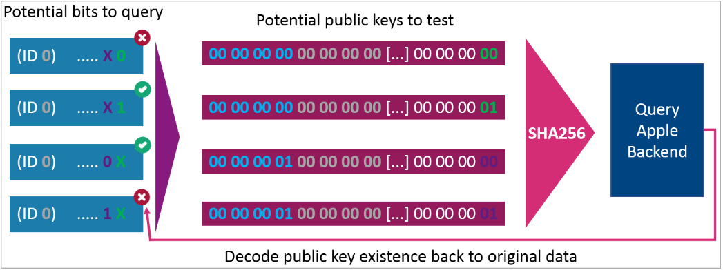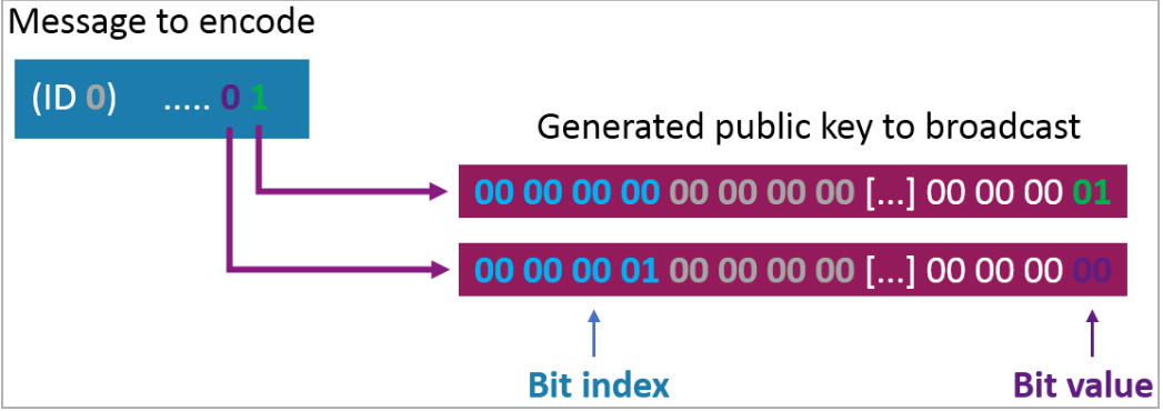 发送者需要创建大量不同的公钥加密密钥来模拟多个AirTag,并在密钥的预定义位置分配特定位移编码任意数据。