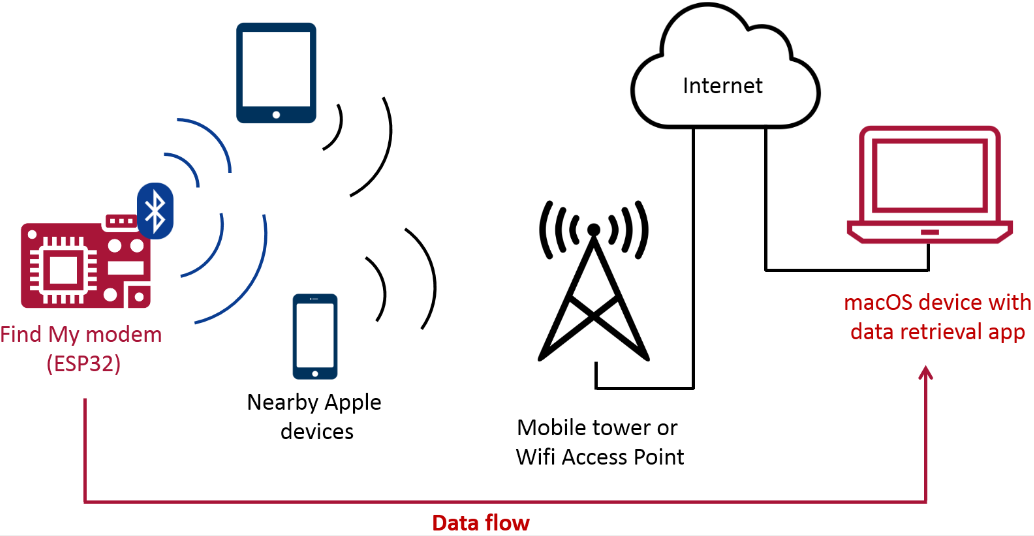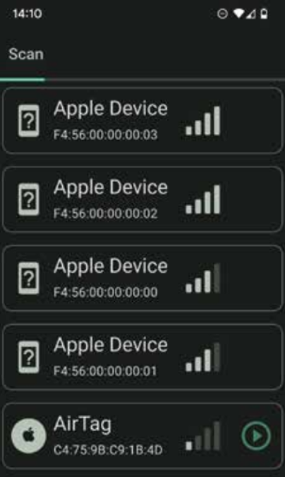 蓝牙传输比WLAN键盘记录器和Raspberry Pi设备更加隐秘。此外,Find My平台可以利用广泛存在的苹果设备进行信息传输的中继。键盘记录器无需使用AirTag或官方支持的芯片,因为苹果设备会对所有蓝牙信息进行响应。如果信息的格式正确,接收到的苹果设备就会创建一个位置报告并上传到Find My网络。