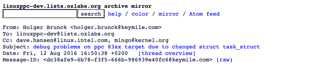 为此,Ariel 花了 3-4 天时间去详细地了解阅读与 PowerPC 架构相关的提交描述以及关于 task_struct 的更改,试图弄清楚这个问题是否在后续的内核版本中得到解决(这里剧透下:其实并没有解决)。