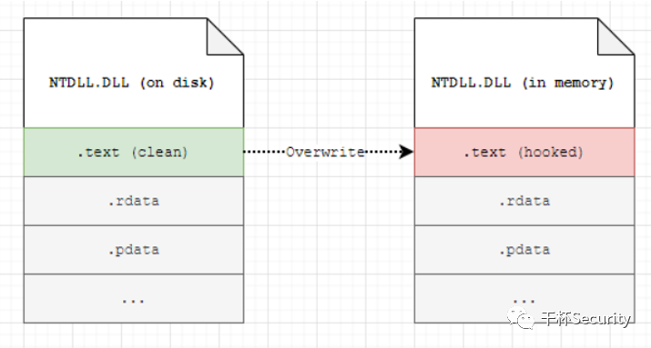 通过读取磁盘上ntdll.dll的.text节,覆盖内存当中的ntdll.dll的.text节,达到脱钩的效果