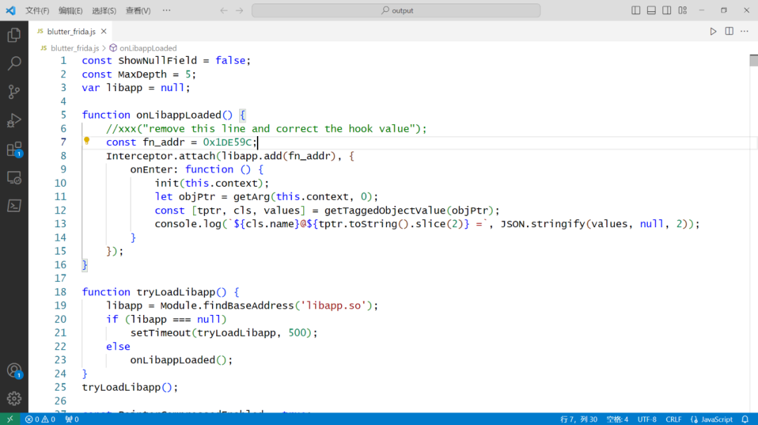 接下来我们使用输出文件夹中的blutter_frida.jshook一下sub_1DE59C看看情况。