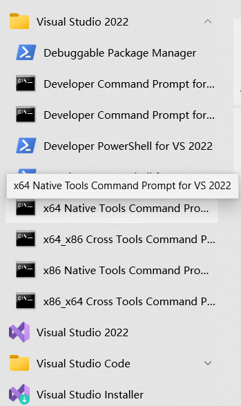 请注意,接下来我们需要打开x64 Native Tools Command Prompt,它可以在Visual Studio文件夹中找到。
