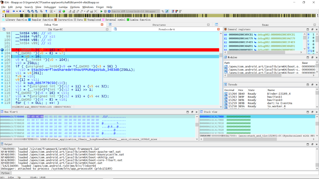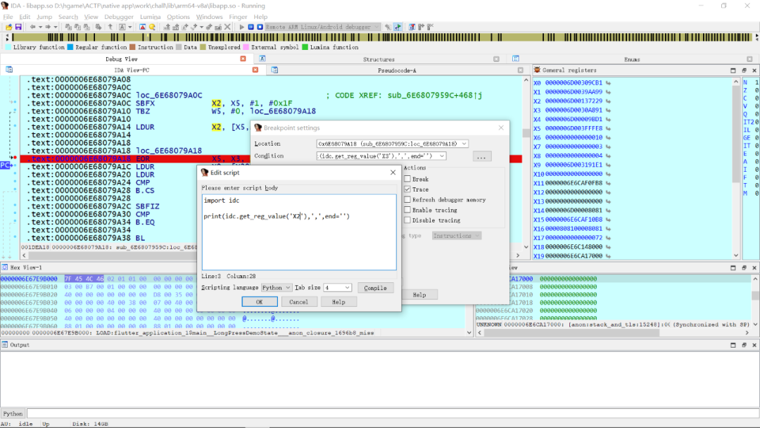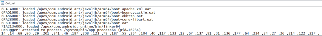 现在我们得到了一个数组,我们就暂时认为它就是flag经过加密之后得到的结果,接下来我们在IDA中对sub_1DE59C下断点动态调试来更加深入的研究一下。