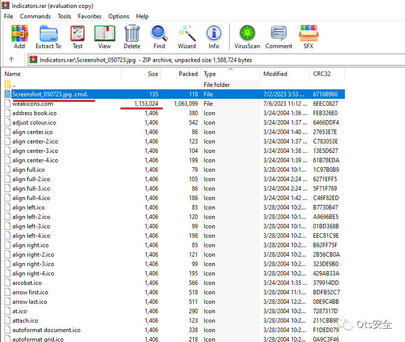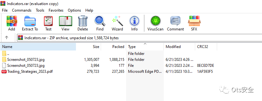 下载文件并尝试查看文件结构后,您将能够找到以下文件和该结构由两个组件组成:名为Screenshot_050723.jpg的文件夹,其中包含同名文件Screenshot_050723.jpg和Trading_strategies_2023.pdf。此外,该文件夹中还有一个名为Screenshot_050723.jpg.cmd的文件和一个名为weakicons.com的大文件。