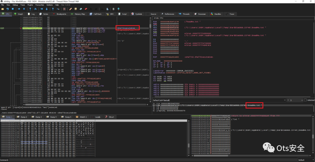 在查看比较函数时,我们会意识到该漏洞的根本原因是因为 r8 标志设置为6,这意味着代码将使用winrar.7FF6CE909948函数使用部件号对两个文件名进行比较上图中的 2 ,即文件名“ ReadMe.txt”和“ ReadMe.txt //ReadMe.txt.cmd”的else条件由于该函数不比较整个名称,因此返回true,因为它比较文件具有目录名称,并且不包含该目录内的文件。例如,如果我们有两个名为“ HackThePlanet.txt” 和HackThePlanet.txt /hack.txt.cmd的文件,该函数将返回 true 并将该文件添加到临时文件夹中以提取并执行。在我们的例子中,我们希望将其传递给 ShellExecuteW,稍后我们将介绍它