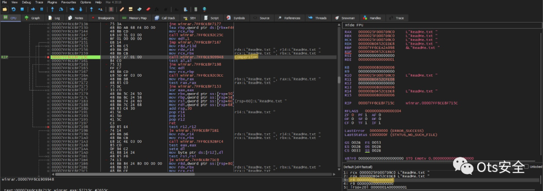 我们开始调试应用程序,同时触发漏洞以查明根本原因。在这个过程中,我发现双击ReadMe.txt文件后,调用了一个名为winrar.7FF6CE909948的函数。该函数对文件之间的名称进行比较,接受三个参数:clicked_file_name、the_another_file、flag和flag,即下图中 的r8 :