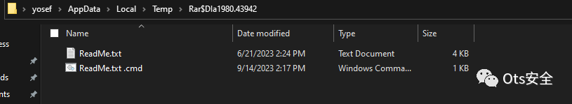 我们可以看到,临时目录中有两个文件:第一个文件是ReadMe.txt,文件末尾没有空格,第二个文件是ReadMe.txt .cmd,它的 cmd 扩展名前有一个空格。Windows 将文件的最后部分视为当前或实际扩展名。