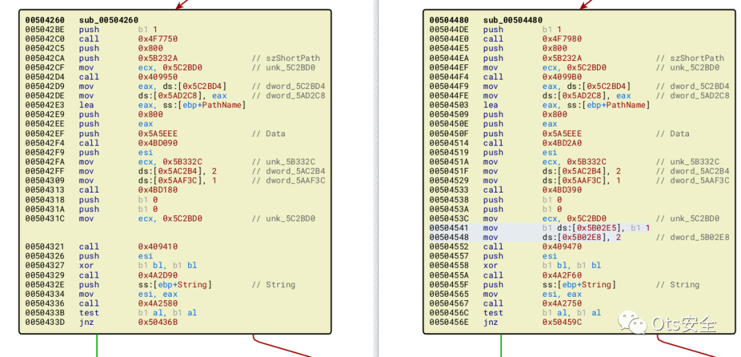 在对易受攻击的版本和已修补版本之间执行补丁比较时,在确定比较行为1和2的标志中识别出这些函数之间的差异。这个特定问题已在修补版本中得到解决,方法是在创建临时文件之前设置此标志,以确保不会加载多个文件,如下所示BinDiff: