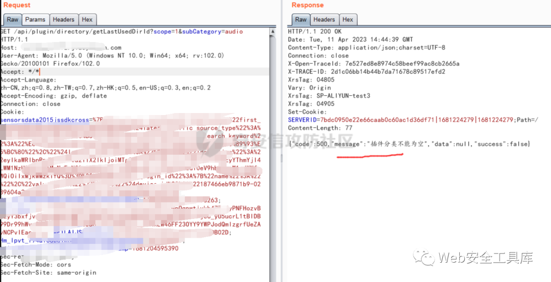 其中响应包中响应的“插件分类不能为空”让我百思不得其解,不知道是缺了什么参数。那么这里就再回到js中看看吧,果然,给我发现了端倪: