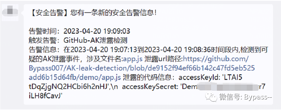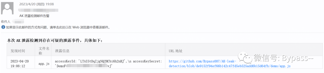 (2)邮件告警,检测到可疑的AK泄露事件邮件立即告警。