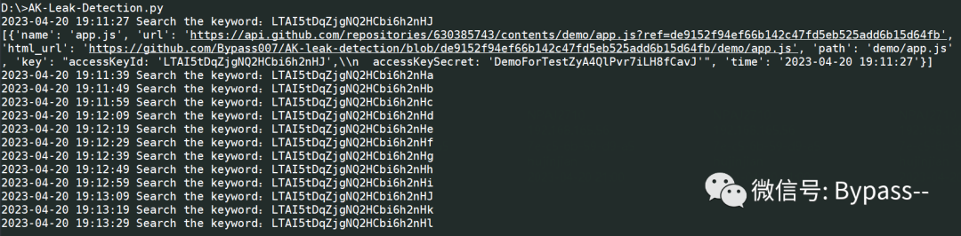 (1)AK泄露检测工具运行效果,每十秒搜索一次,请求失败后30秒自动重发机制。