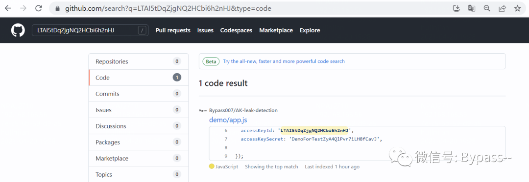 另外,从用户代码上传到Github到检测发现也是需要时间,例如,我在GitHub上新建一个仓库,并上传了包含accessKey的app.js文件,调用Github API接口搜索accessKeyId,需要45分钟左右才能搜索到关键特征。