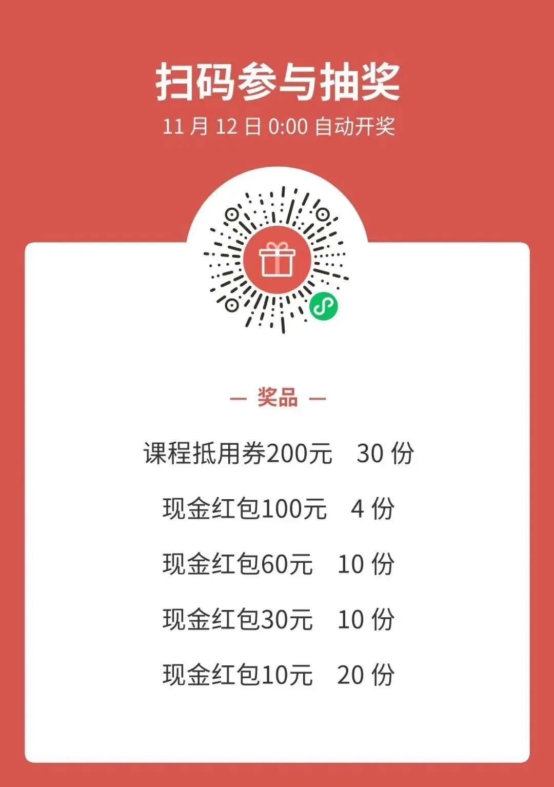 11.7-11.11号,关注公众号并转发本文至朋友圈,点击下方小程序参与抽奖,瓜分1500元现金红包与课程抵用券~