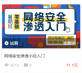 11.1元限量秒杀课程:网络安全渗透小白入门(原价99.9元,限量50份,售完为止)