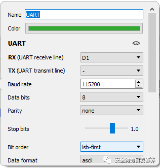 首先,我们选择我们的 Rx 线作为包含流量的通道;在我们的例子中,这将是.对于所有其他字段,我们将将它们保留为默认值、8 位数据宽度、无奇偶校验等。D1