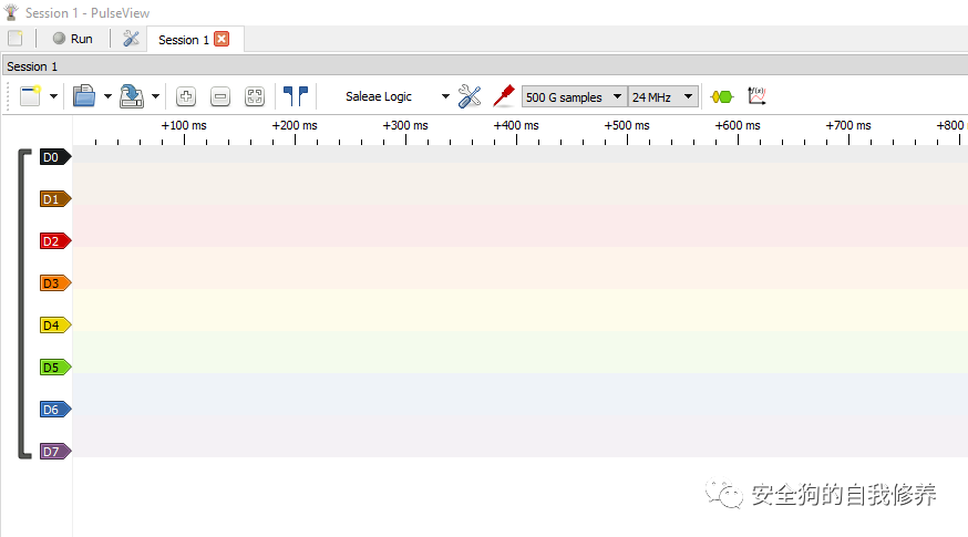 连接分析仪后,我们将启动 Pulseview 并从下拉菜单中选择我们的分析仪;此设备在 PulseView 中显示为“Saleae Logic”设备。该分析仪的最大捕获速率为24MHz,我们将用于分析。我们还需要指定样本计数,我将其设置为 500G 样本。