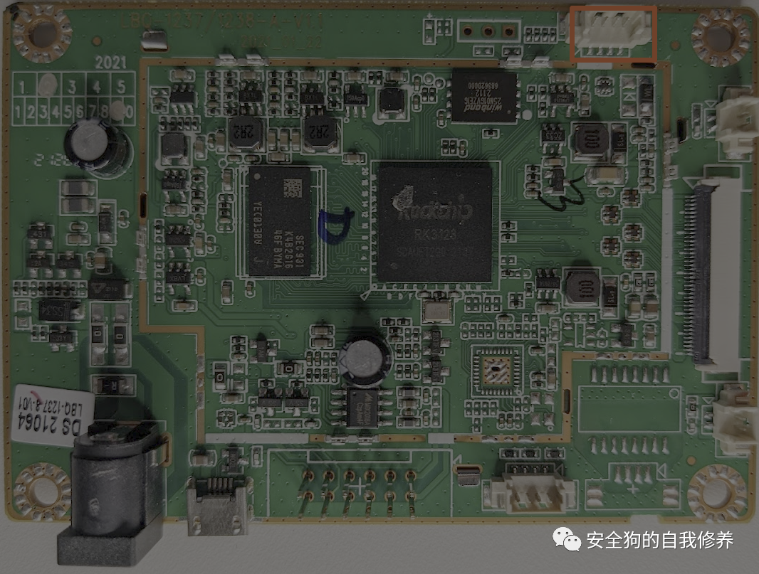 最后,最后一组打击垫看起来与用于 USB 和音频的连接器非常相似。在查看未使用的焊盘时,像这样的四引脚连接通常是通过UART进行调试控制台的候选者;我们将在下一节中检查这些标头并讨论 UART。