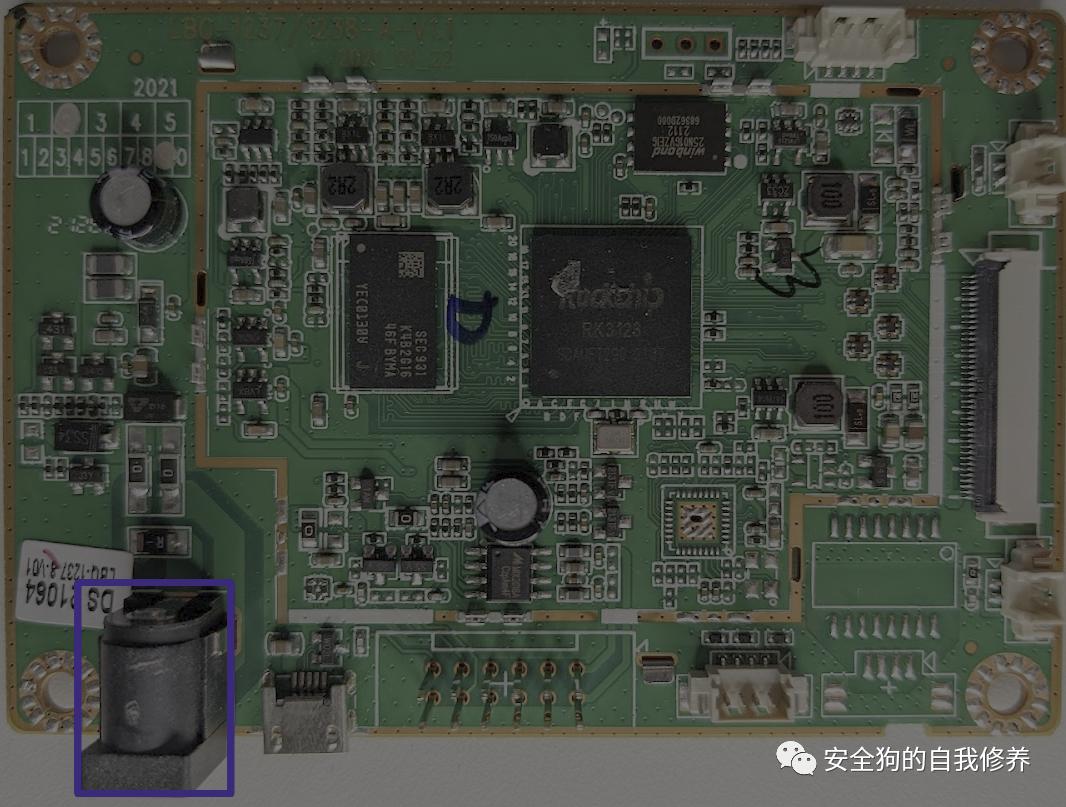 现在我们已经记录了主板上的分立元件,我们将尝试识别主板上的外部连接器。首先,我们有桶形连接器;此连接器是 在下图中以蓝色勾勒出轮廓:
