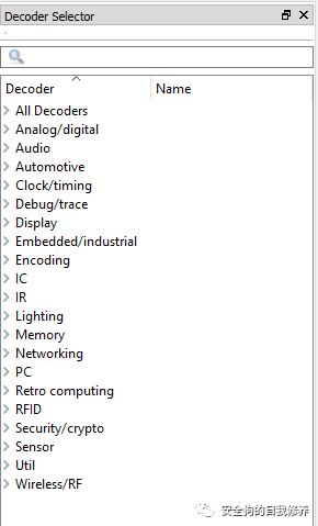 使用 pulseview,我们可以尝试解码此流量,并查看它是否确实是活动的 UART。要设置解码器,请单击下面的绿色和黄色符号。这将打开解码器选择窗口,在搜索栏中键入 uart,然后选择 UART 解码器。