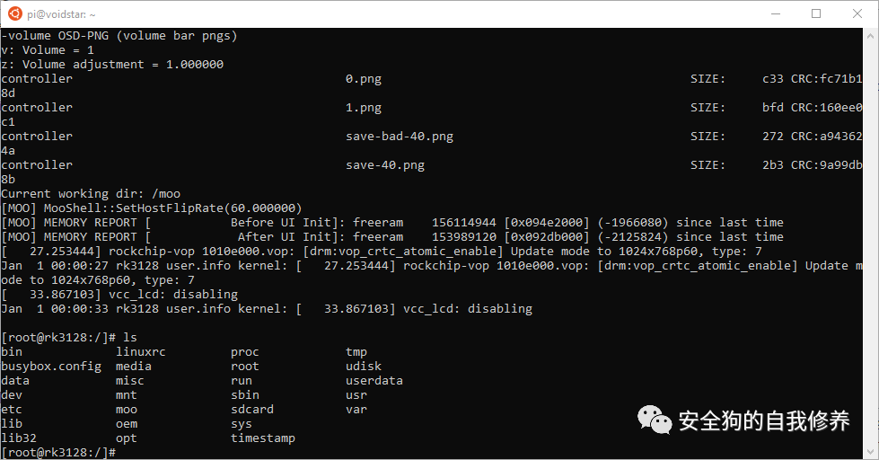 现在我们有了一种可靠的方法来读取和写入闪存,让我们简要检查一下内容。有趣的文件位于文件夹中。此文件夹包含模拟器及其相关资产。Moo 是一个使用自定义 ROM 格式的自定义模拟器;2020 年,一些研究人员在不同版本的模拟器上做了出色的工作。但是,如果我们查看目录内容,就会发现一些有趣的事情:/moo