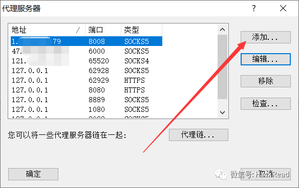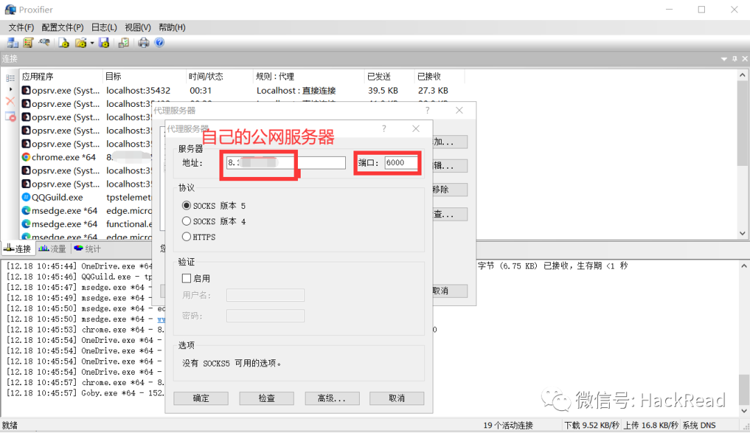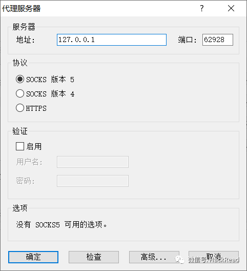 找到代理的服务端的IP和端口(本地代理服务就是 127.0.0.1)并填写和选择对应代理协议,如下图所示: