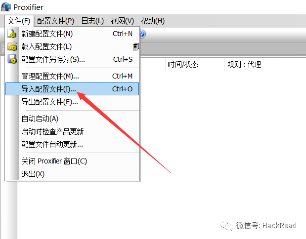 然后点击 Proxifier 左上角的“文件”-->“导入配置文件”,选择解压出的 Default.ppx 文件即可导入成功