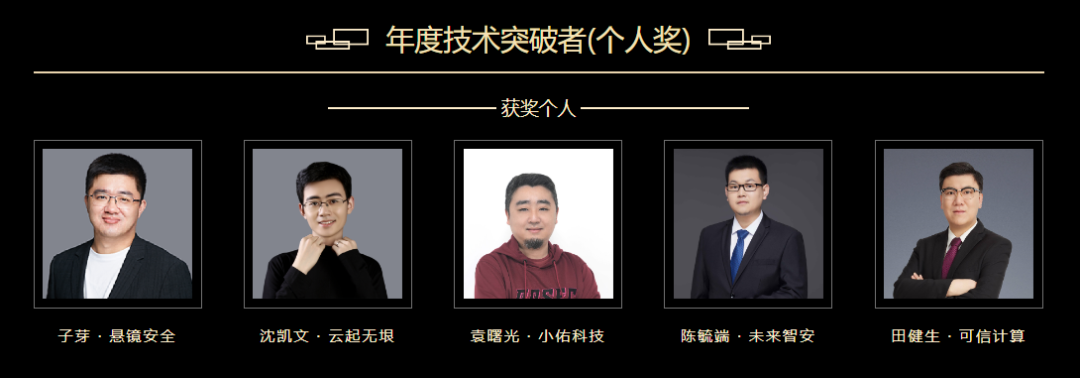 年度技术突破者前五名单:子芽 · 悬镜安全、沈凯文 · 云起无垠、袁曙光 · 小佑科技、陈毓端 · 未来智安、田健生 · 可信计算。