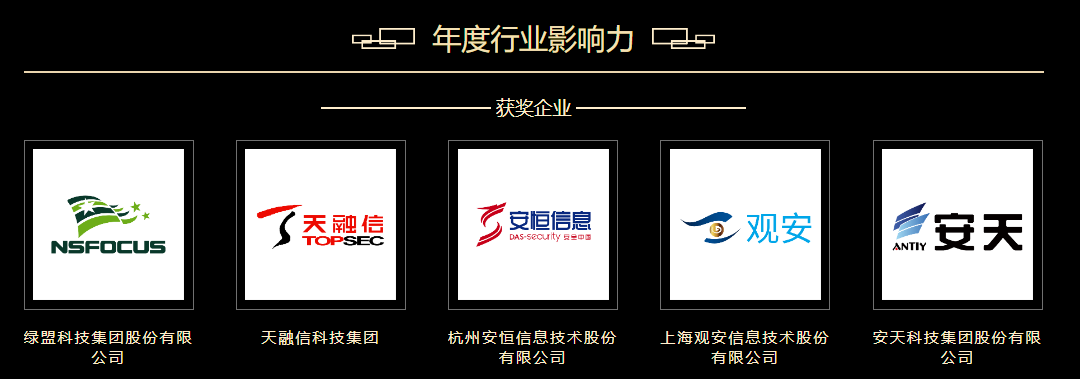 年度行业影响力前五名单:绿盟科技集团股份有限公司、天融信科技集团、杭州安恒信息技术股份有限公司、上海观安信息技术股份有限公司、安天科技集团股份有限公司。