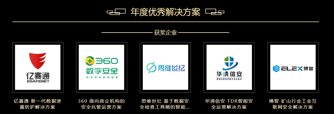 年度优秀解决方案前五名单:亿赛通 新一代数据泄露防护解决方案、360 面向政企机构的安全托管运营方案、思维世纪 基于数据安全检查工具箱的智能化数据安全风险评估解决方案、华清信安 TDR智能安全运营解决方案、博智 矿山行业工业互联网安全解决方案。