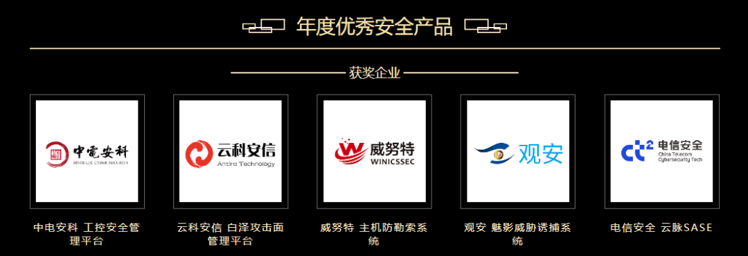年度优秀安全产品前五名单:中电安科 工控安全管理平台、云科安信 白泽攻击面管理平台、威努特 主机防勒索系统、观安 魅影威胁诱捕系统、电信安全 云脉SASE。